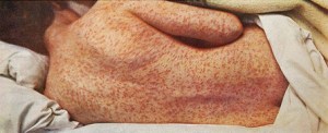 Q. Does this child have the a). chicken pox b.) measles c.) heat rash or are they d.) having an acute allergic reaction?