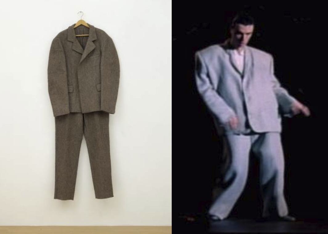 A. The suit on the left (made of felt) is the work of Joseph Beuys and the suit on the right (worn by David Byrne in the film Stop Making Sense) is a reference to Beuys’ original suit. The work of Joseph Beuys is complex beyond what can be explained here except to say that he used felt in many of his conceptual pieces as a symbol of spiritual protection and played with the idea that inanimate objects have magical qualities. Byrne has extended (and paid homage) to this idea by creating a suit that “grows” while he is performing. Byrne’s suit, like Beuys’ symbolic original, has a life of its own. This reference is included because it is somewhat different from the other references to fine art in popular culture which have been discussed previously. Byrne, himself a fine artist, is not “borrowing” from Bueys, he is referencing and extending the original idea…and essentially having a “conversation” with the original work of art.