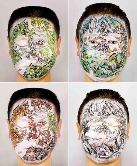 A. This is the work of Chinese artist Huang Yan (Four Seasons) who is making an unbelievably innovative and original statement in the tradition of classical landscape painting. By using his own body as the canvas he is contemporizing a traditional form of painting, and making an historical, philosophical, and personal statement about the roots of identity (and, not coincidentally, about Buddhist transience and permanence). It amounts to a brilliant extension of the history of Chinese landscape painting.