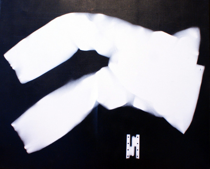 A. Positive space is the area occupied by the main subject and negative space is the surrounding area (or the background). These paintings by Francois Arnal play very effectively with positive and negative space. They were made by laying objects down on canvas (notice the shapes of razors and hinges among the softer shapes made by fabric), and then applying paint over them so that the shapes leave a ghost-like impression. The main image area (normally considered positive space) is white and vacant in these paintings, giving the impression that we are looking at an x-ray. Arnal has made a very clever space exchange by disrupting our experience of occupied and unoccupied space. These paintings call our attention to invisible interior spaces (like the change in your pocket or the organs inside your body). Just because we cannot see them, does not mean that they are not there.