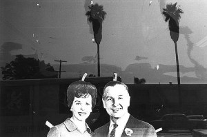 The photograph below, also by Lee Friedlander, is of a cut out couple in a plate glass window. The reflection of the parking lot and setting sun tells a very different story here about social and personal artifice.