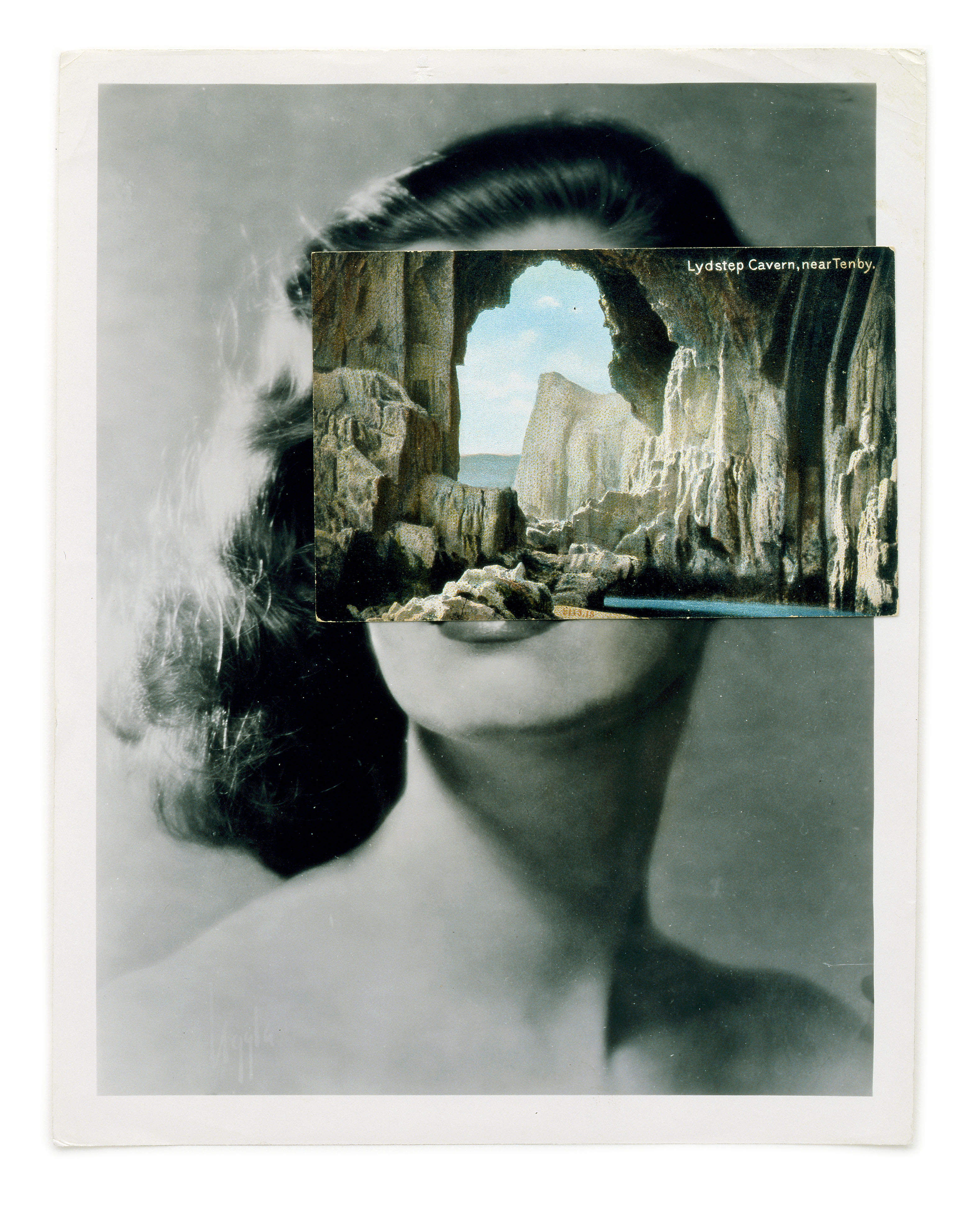 The work below, by John Stezaker, is another example of re-appropriation. By merging disparate images, in this case a glamourous studio headshot with a scenic postcard, he has created a new image with an entirely new meaning. In the new image, a psychological rater than representational portrait is offered and below the surface, this beauty is sadly vacant and cavernous.